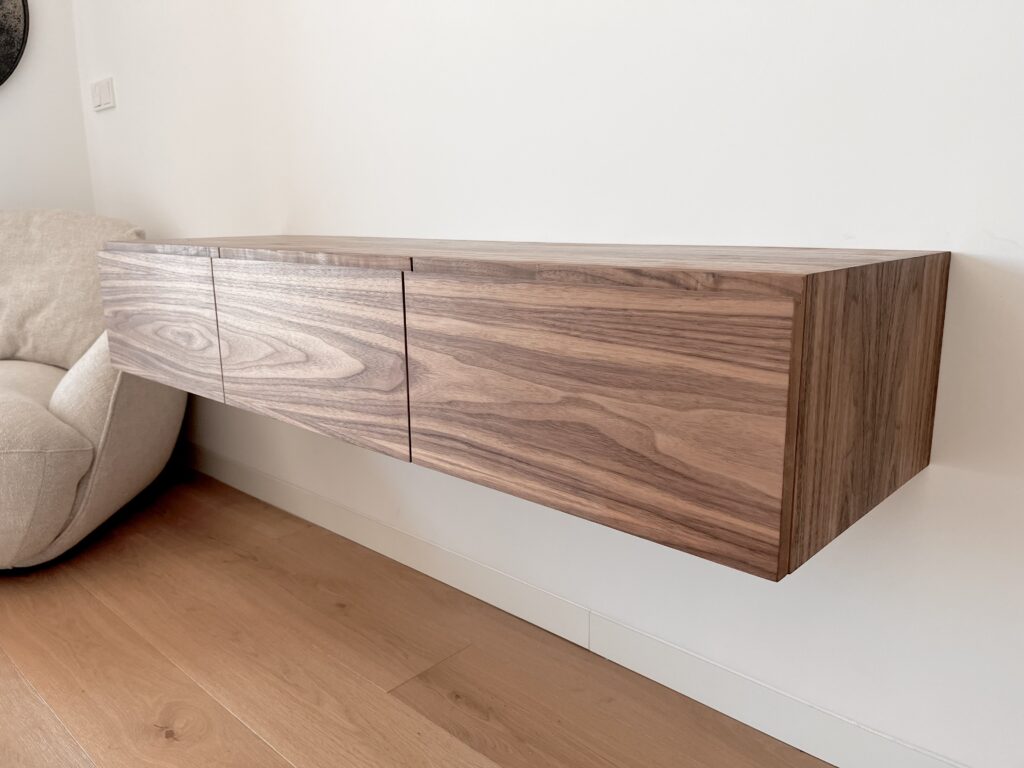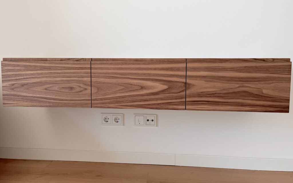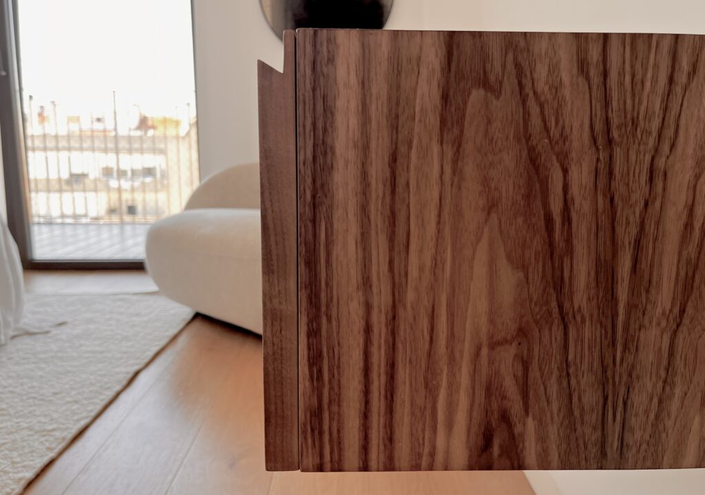Foi com muito gosto que aceitamos o desafio da designer Lara Martins, desenvolvemos e concretizamos esta bonita consola. Estrutura como as gavetas em contraplacado de bétula folheado a nogueira americana. Acabamento com óleo de proteção mate.